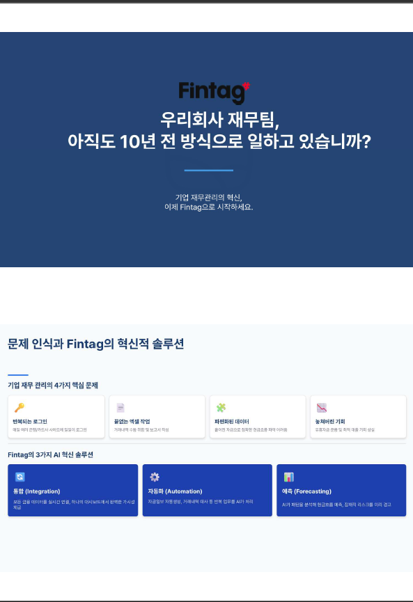 홈페이지 가기 마포대로 78 010-2914-4269 sh.jung@mi-deal.com F-43 [기업소개] ㈜마이딜은 기술을 통해 기업의 비효율을 제거하고 성장을 가속화하는 B2B SaaS 전문 기업입니다. 저희는 15년 이상의 재무 및 핀테크 프로덕트 경험을 가진 전문가들이 모여, 기업이 마주하는 고질적인 문제들을 해결하고자 2022년 9월에 설립되었습니다. 모든 기업이 데이터 기반의 최적의 의사결정을 내리고, 직원들은 더 높은 부가가치를 창출하는 업무에 집중할 수 있는 환경을 만드는 것을 목표로 합니다. 마이딜의 첫 번째 솔루션인 AI 재무 컨트롤 타워 '핀태그(Fintag)'는 파편화된 기업 금융 데이터를 통합하고, 반복적인 재무 업무를 자동화하며, 나아가 AI 기술로 미래를 예측하여 기업의 안정적인 성장을 지원하는 혁신적인 서비스입니다. 저희는 잔디(Toss Lab) 창업가, 전)하나은행 부행장 등 각 분야 최고의 전문가들로 구성된 자문단의 지원과 함께, 국내 1위 MSP 사업자인 메가존클라우드와의 파트너십을 통해 기술력과 시장성을 모두 인정받고 있습니다. 마이딜은 앞으로도 끊임없는 기술 혁신을 통해 모든 기업의 전략적 성장 파트너가 되겠습니다. [제품사진]
