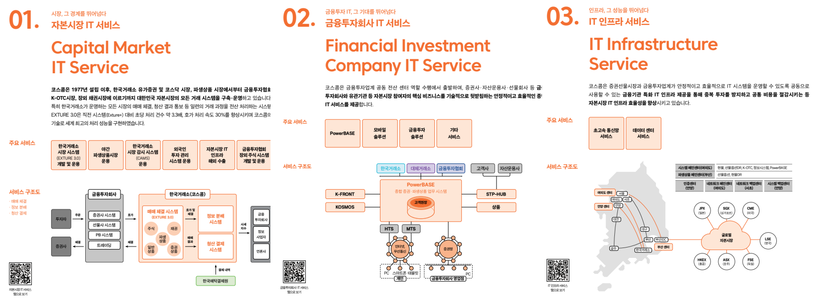 홈페이지 가기 서울특별시 영등포구 여의나루로4길 21 02-767-7114 woo4903@koscom.co.kr C-05 [기업소개] 코스콤은 고객의 눈높이에서 디지털 기술과 금융을 융합한 새로운 비즈니스 모델로 미래를 개척하겠습니다. 1977년 자본시장 IT 인프라를 담당하는 기관으로 출발한 코스콤은, 대한민국 자본시장 역사의 한 축을 담당하고 있는 금융 IT 전문기업으로 성장해 왔습니다. 저희는 자본시장 거래 플랫폼, 금융투자업계 원장 서비스, 금융 정보 분배, 증권망 등 자본시장 IT 인프라를 총망라한 서비스의 제공을 통해 고객 가치의 제고를 위해 끊임없이 노력하고 있습니다. 최근에는 디지털 경제의 확산으로 인한 디지털 트랜스포메이션의 시대에 발맞춰, 지속적인 IT 기술 혁신을 통해 자본시장 거래 플랫폼과 금융투자업계 토탈 IT 서비스의 안정적 운영과 서비스 경쟁력을 강화하고, 금융 데이터 분야에서도 고객에게 새로운 비즈니스 기회를 제공할 수 있도록 적극 노력하겠습니다. 앞으로도 코스콤은 고객과 함께 지속 성장할 수 있는 성공 파트너로서, ‘금융의 새로운 가치를 창조하는 Digital Innovator’로 자리매김할 것을 약속드립니다. 여러분의 지속적인 관심과 성원 부탁드립니다. [제품사진]