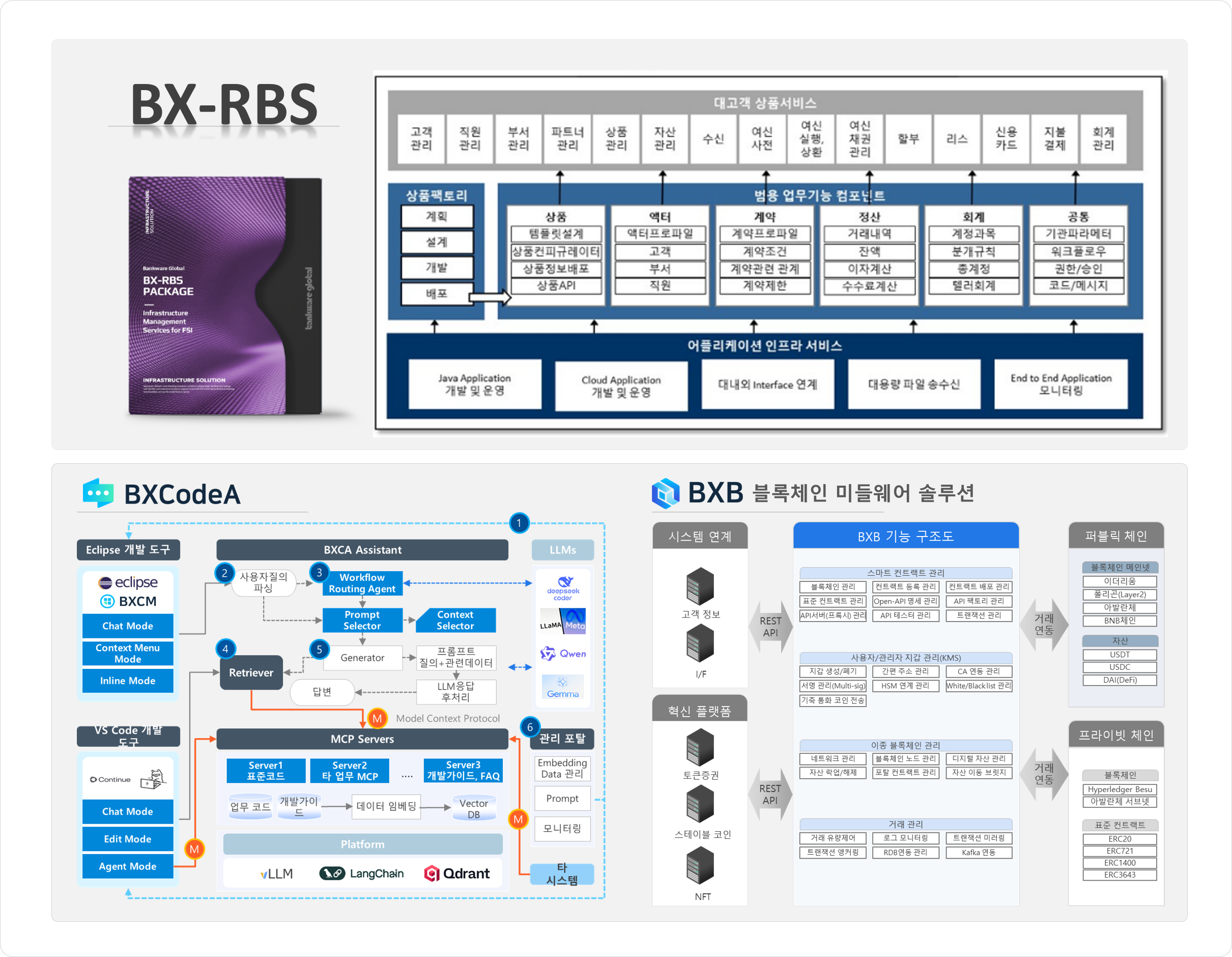 홈페이지 가기 서울특별시 중구 서소문로11길 19, B동 12층 (정동,배재정동빌딩) 02-501-6415 sangman.lee@bankwareglobal.com F-12 [기업소개] 뱅크웨어글로벌은 은행 및 금융회사를 대상으로 코어시스템 소프트웨어를 공급하는 금융 소프트웨어 전문 기업입니다. 금융 기관의 고객 및 상품 정보를 관리하고, 여신, 수신, 할부금융, 카드 등 금융상품 거래를 높은 신뢰도와 성능, 안정성을 갖고 처리하는 코어금융 소프트웨어를 자체 기술로 개발하여 국내외 100여 금융기관에 공급해오고 있습니다. 또한, 당사 소프트웨어를 기반으로 한 금융회사의 코어시스템 구축 컨설팅, 시스템 설계, 구축, 운영 등 토탈 솔루션을 제공하고 있습니다. 뱅크웨어글로벌은 코어시스템을 구축하는 중대형 금융회사를 대상으로 코어뱅킹, 할부금융 등 당사 소프트웨어 제품의 라이선스를 판매하고 동 소프트웨어 도입 금액의 일정비율을 매년 수취하는 소프트웨어 유지보수서비스를 제공합니다. 해외시장에서는 코어뱅킹 등 금융 소프트웨어를 다년간 매월 고객계좌수 등의 사용량을 기준으로 비용을 청구하는 구독형 서비스를 운영하고 있습니다. 또한, 당사는 금융 및 플랫폼 소프트웨어 패키지를 공급하고 동 소프트웨어를 기반으로 한 고객 맞춤형 소프트웨어 시스템 구축사업을 수행하고 있으며, 당사가 구축한 애플리케이션 시스템을 운영하고 관리하는 서비스도 함께 수행하고 있습니다. 뱅크웨어글로벌은 설립 이후 지금까지 연평균 30.92%의 고속 매출성장을 이루었으며, 이러한 성과에 힘입어 2022년에는 천만불 수출의 탑을 수상하였고, 산업자원부의 월드클래스 플러스(+)기업에단독 선정된 바 있으며, 2024년 8월 코스닥 상장을 달성하였습니다. 최근 국내 대형은행 생성형 AI개발 지원 플랫폼 구축 및 STO 블록체인 미들웨어 솔루션 제품을 출시하여 사업 영역을 확대하고 있습니다. [제품사진]