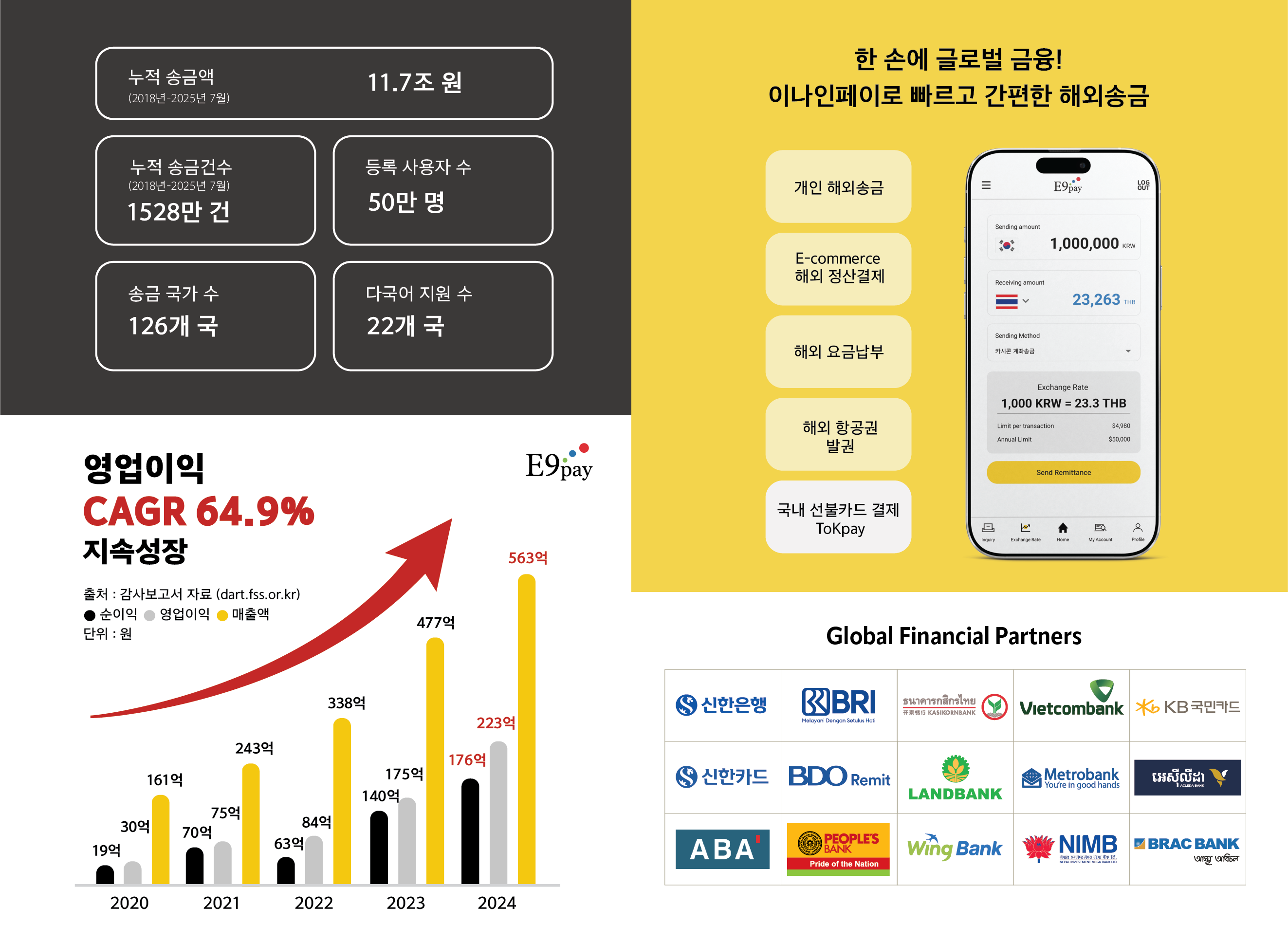 홈페이지 가기 08758 서울시 관악구 남부순환로 1793, 8층 02-877-7200 forex@e9pay.co.kr F-09 [기업소개] 이나인페이는 2017년 기획재정부로부터 대한민국 최초의 1호 해외송금업자로 등록하여, 한국에 거주하는 외국인들의 금융 문턱을 낮추는 것을 목표로 출범한 크로스보더 송금·결제 핀테크 기업입니다. 은행 방문이 어려운 외국인들에게 모바일 하나로 언제 어디서나 편리하게 이용할 수 있는 해외송금 및 금융생활 서비스를 제공하여, 금융 포용의 새로운 길을 열고 업계를 선도하고 있습니다. 2024년 3월에는 업계 최초로 개인정보보호 ISMS-P 인증을 획득해 보안성과 신뢰성을 인정받았으며, 한국 소상공인들을 위한 신속하고 안전한 글로벌 송금·결제 서비스도 제공하고 있습니다. 현재 이나인페이는 국내외 주요 금융기관과의 네트워크, 외환 노하우 및 15개국 다국적 자체 고객 지원망을 바탕으로, 외국인 고객들에게 선불폰 충전·결제, 은행계좌 개설, 신용·체크·선불카드 발급 등 다양한 금융 서비스를 제공하며 편리한 금융 생활을 지원하고 있습니다. [제품사진]